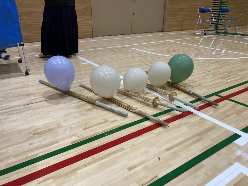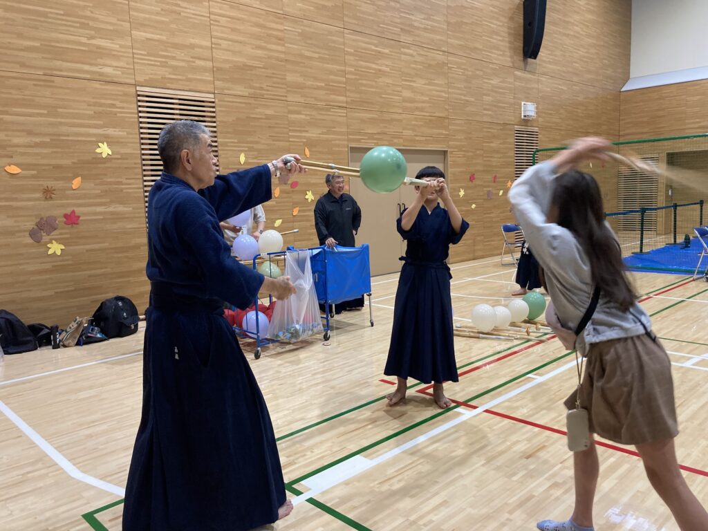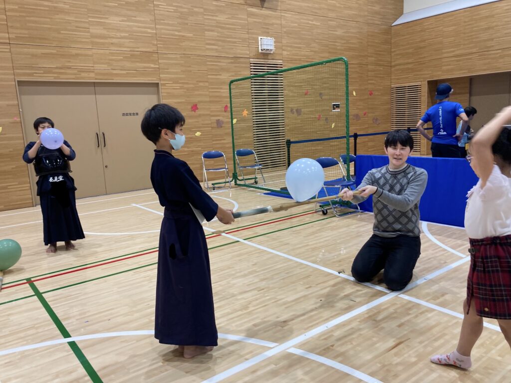 花見堂剣友会は、この施設のメンバー団体として毎年「面打ち体験」の出展を行っていますが、今年は趣向を変えて、「竹刀をふって風船を割ろう!」という遊び心を加えたイベントを行いました🎈
